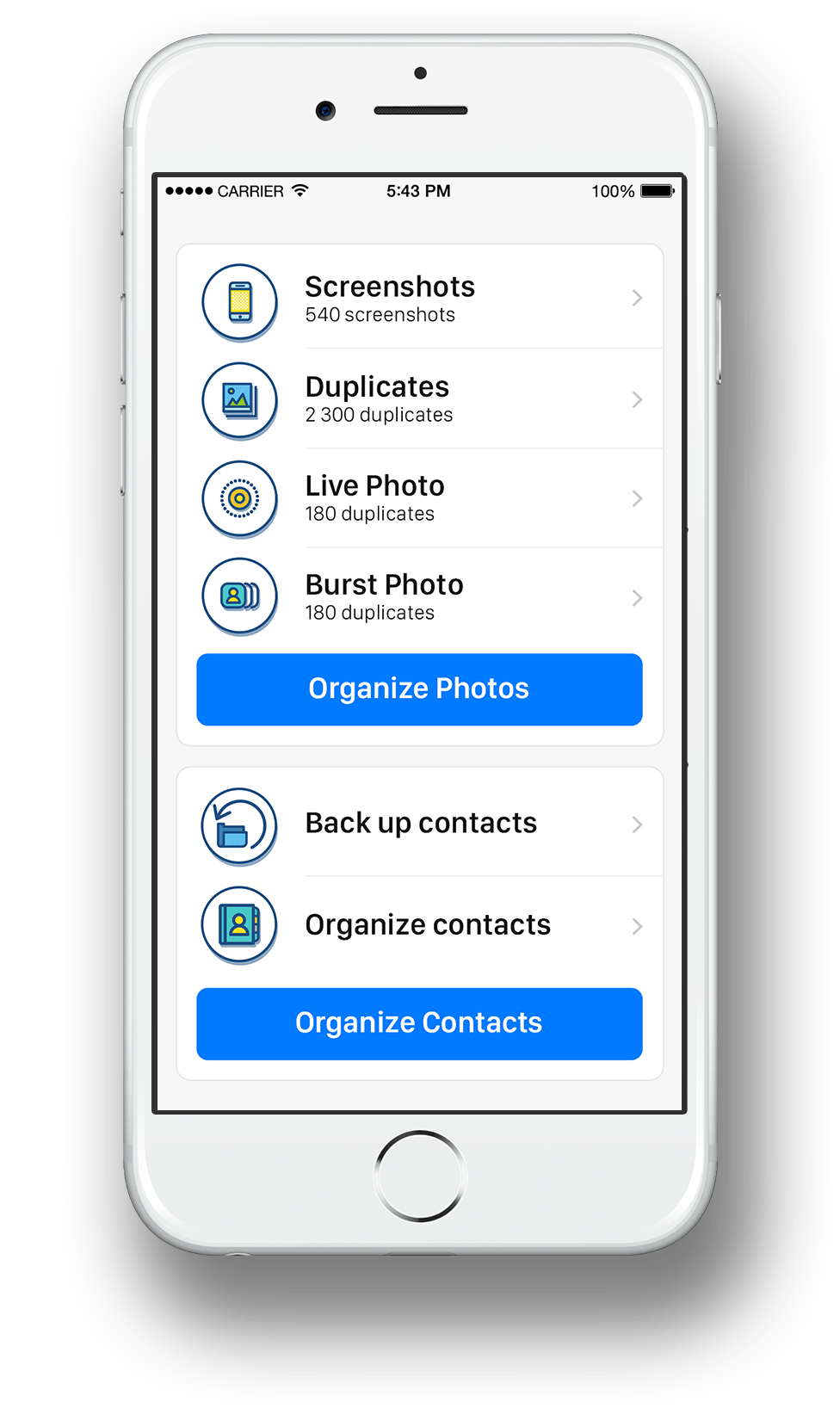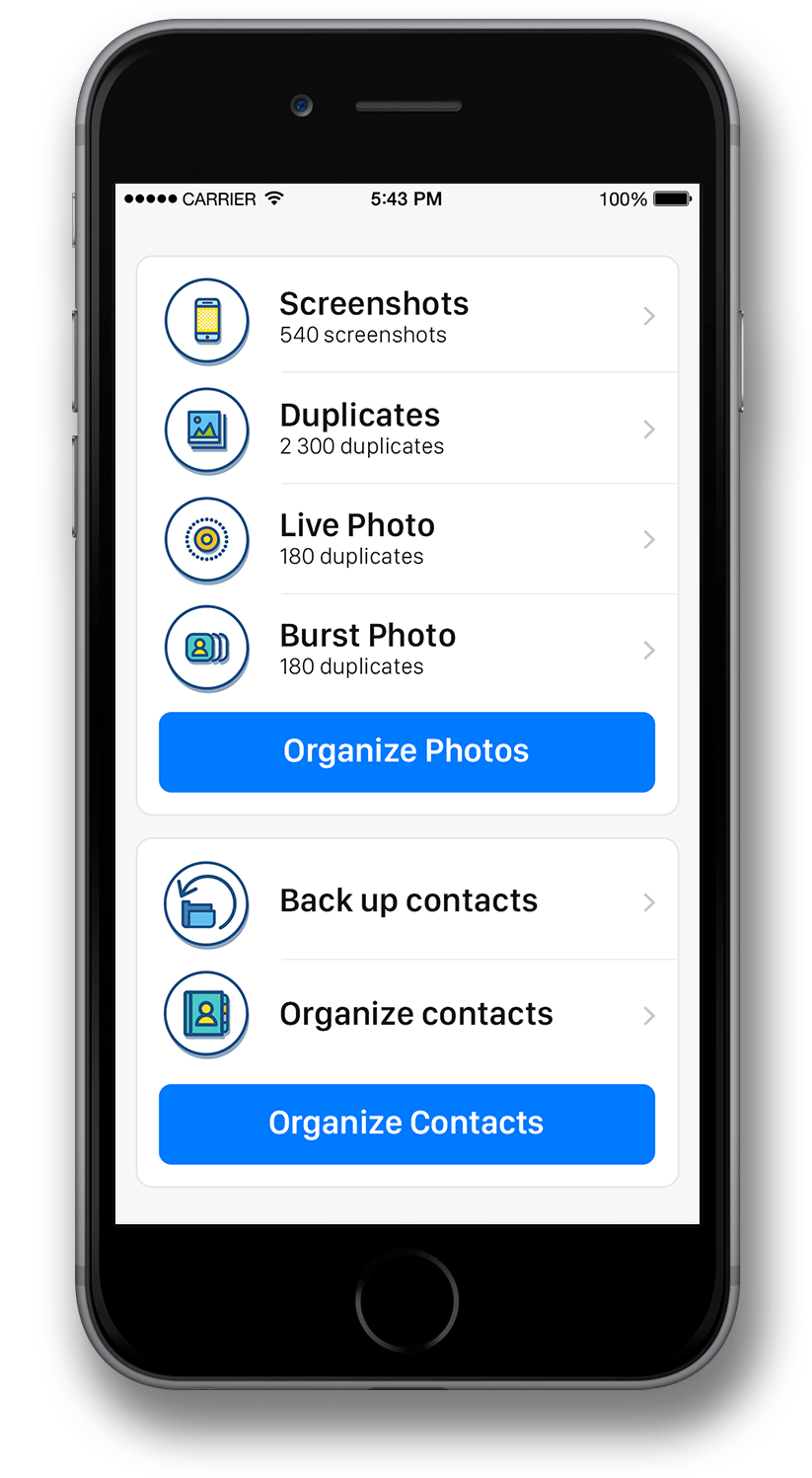 Easily remove duplicate contacts, duplicate pictures, screenshots and Live Photos on your iPhone.
